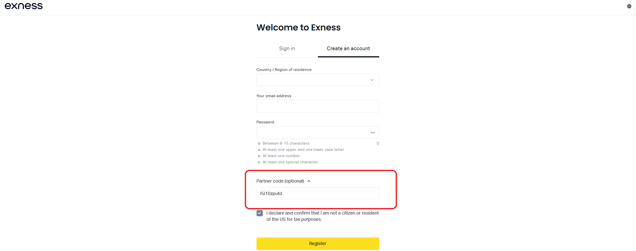 The field you need is on the Exness registration page, directly below the password input. It is labelled "Partner code (optional)" and because of that "optional" label, many people scroll straight past it without a second thought.